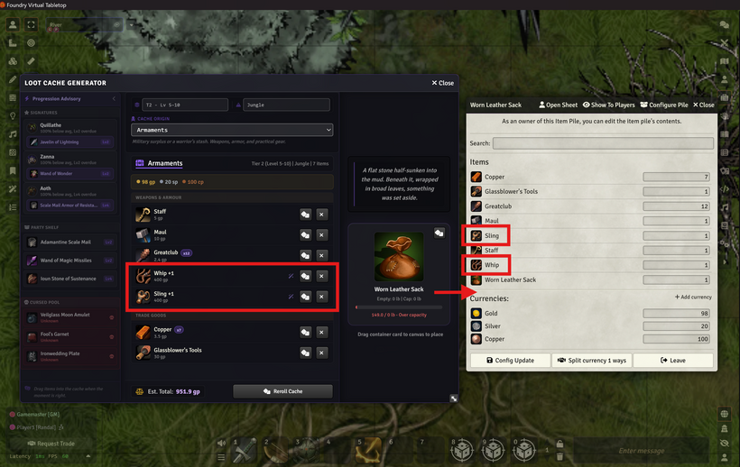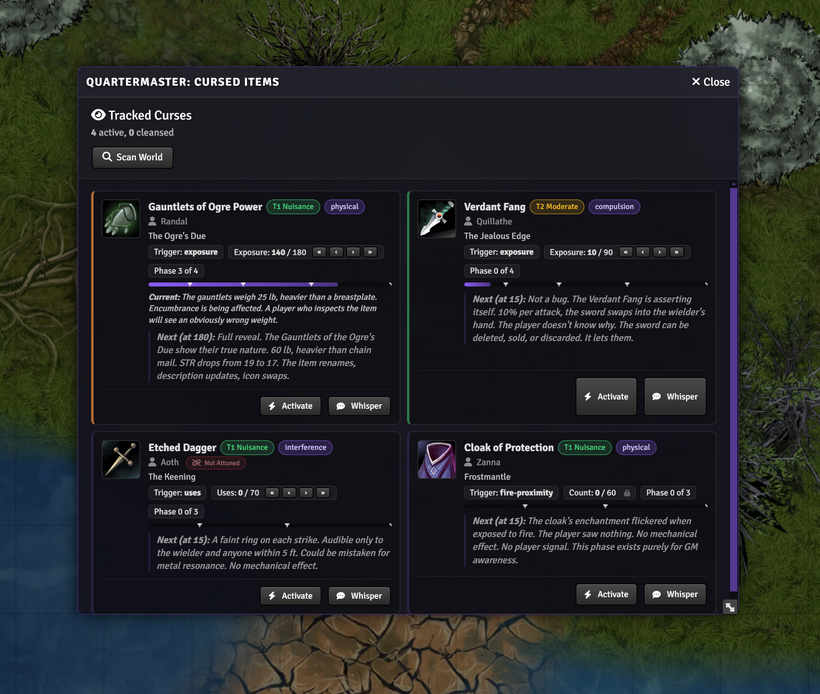 All of this runs in the background, but GMs need to see what's happening. The module has a tracking panel that shows every cursed item in play, across all characters, at a glance.