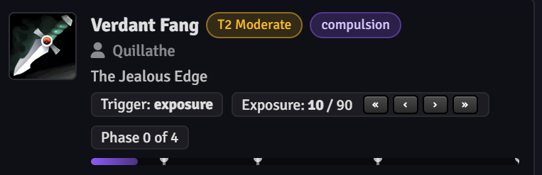 That arc plays out across weeks of sessions. Four phases, each one a little more obvious than the last. The GM didn't have to track any of it manually. The exposure counter ticked up in the background, each phase triggered its own changes, and the item slowly became something different from what identification promised. Same item. Same attunement slot. Different problem.