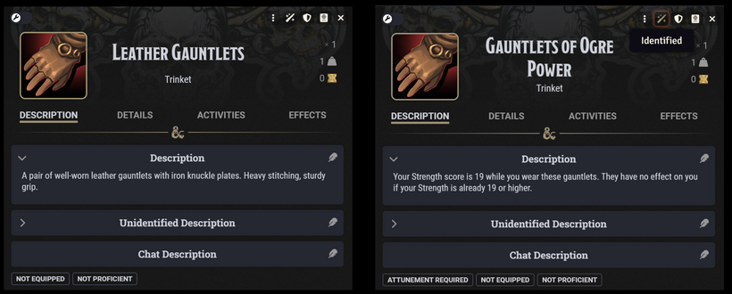 A player finds them in a loot cache. They look mundane. "Leather Gauntlets," 1 lb. After identification: Gauntlets of Ogre Power. STR 19, requires attunement. Good find. The strength bonus is real.