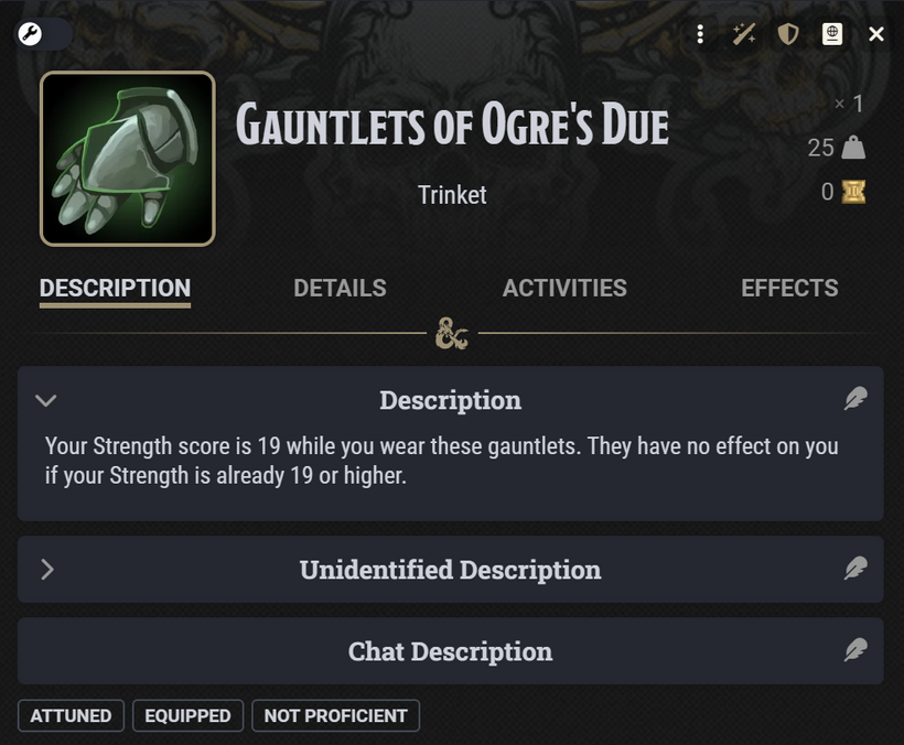 By the final phase the item has renamed itself, the STR has dropped from 19 to 17, and the gauntlets weigh 60 lb. "The gauntlets gave you ogre strength. Now the ogre wants it back."