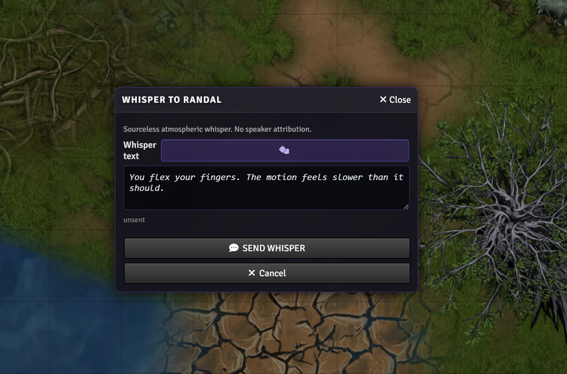 The GM can whisper atmospheric hints from a built-in pool. Sourceless, in-character messages: the kind of thing that builds dread without giving anything away. The panel tracks which hints have already been sent so they don't repeat. A dice button picks a random one to keep them varied.